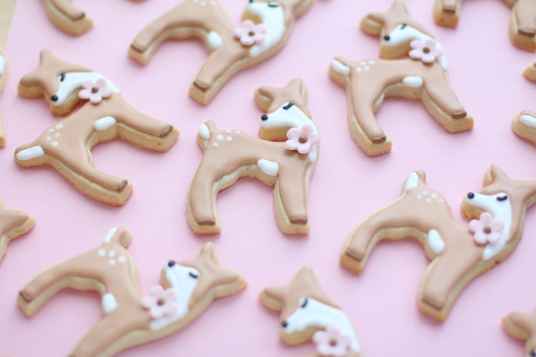 Cut little flowers out of fondant and glue onto your sweet deer with royal icing. Pipe a tiny dot in the center of each bloom with the white or brown icing. Finally, take your trusty black royal icing out of the fridge and pipe eyes and noses using a number 1 tip (I always keep a bit of black royal icing on hand).