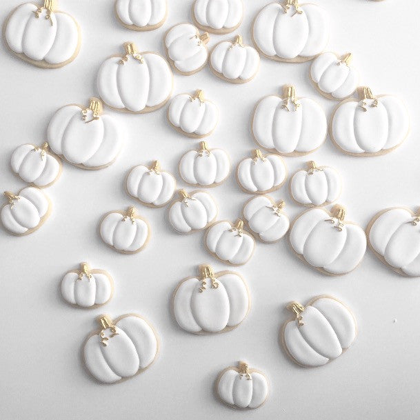 Just as we're rounding out fall and transitioning into winter, what could be better than giving the classic symbol of fall- the pumpkin- more of a snowy winter vibe? Catherine of @birdandbiscuit shows us how to make these gorgeous white pumpkin cookies using CookieCutterKingdom's Pumpkin Cutter!