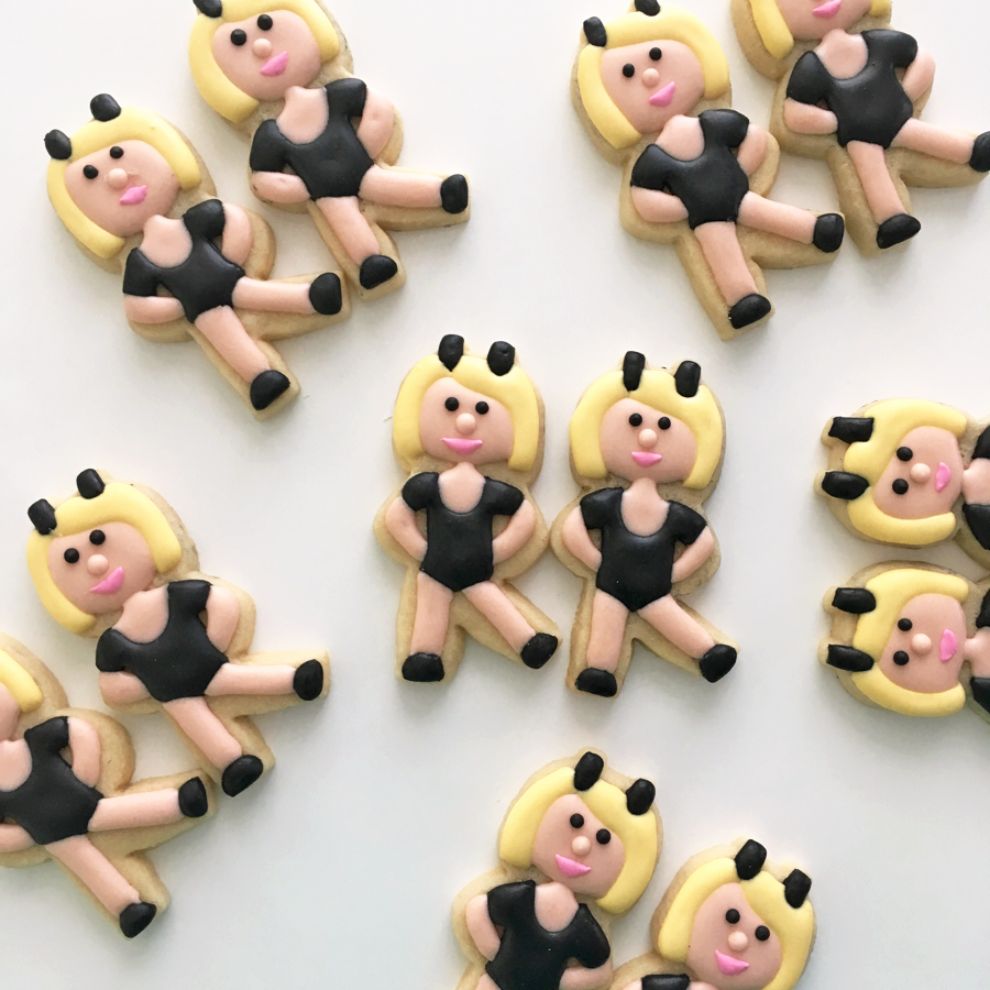 When your girls are all suited up with shoes, bodysuits, and ears, it’s time to give them legs and arms. Since you have the bodysuits and shoes as a reference, simply pipe the legs by connecting them with two vertical lines and flood with the skin tone icing you’ve created. I used AmeriColor gel in warm brown, with a hint of peach and lemon yellow. Add arms using the bodysuit sleeves as a guide for thickness, and connect to the hip.