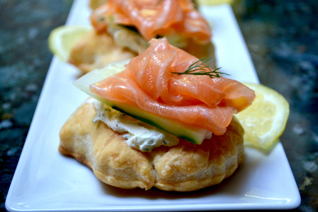 In small bowl, combine cream cheese, dill, and lemon zest. Take one puff pastry seashell and spread dill-lemon cream cheese on top; layer with two sliced cucumbers and one slice of smoked salmon; garnish with dill if desired.